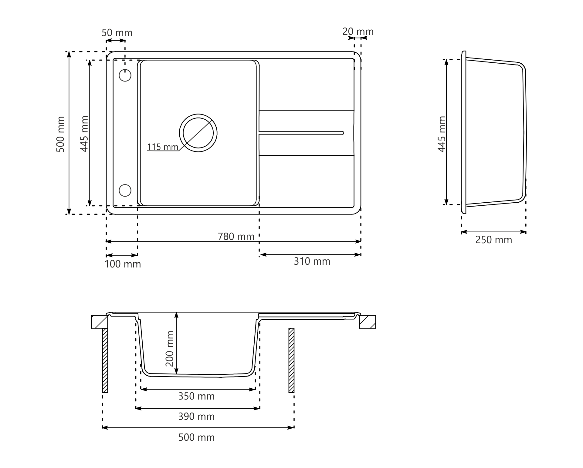 Rozmery sa môžu líšiť o 5 mm. Hrúbka dosky pre drezy s odkvapkávačom by mala byť aspoň 30 mm, vzhľadom k výstuhám medzi vaňou a odkvapkávačom.