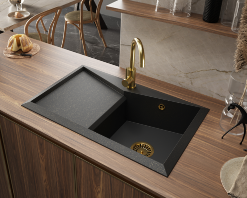 Set obsahuje dřez Decoro 0.0, baterii Noemi zlatú a zlatý klasický sifón